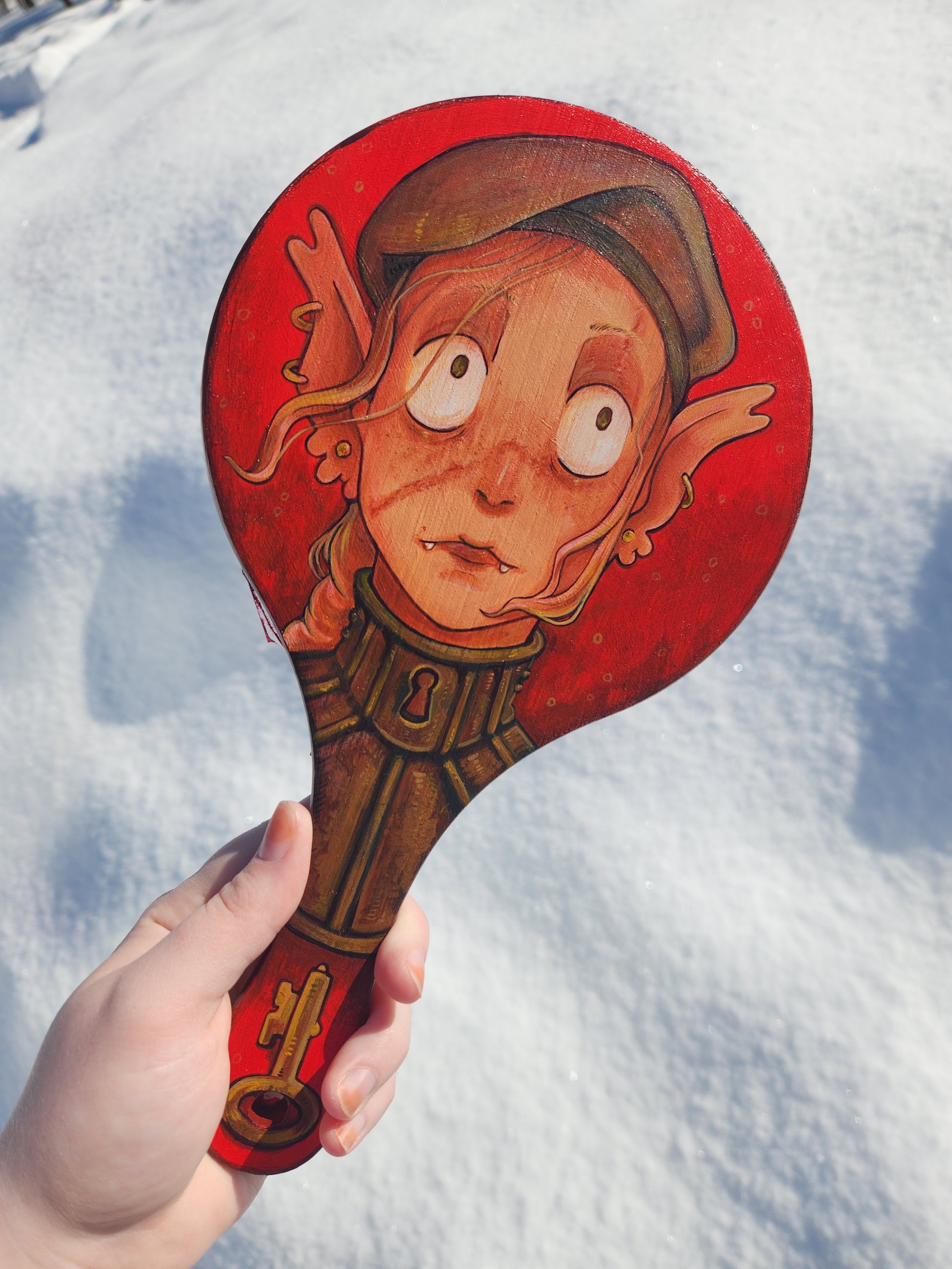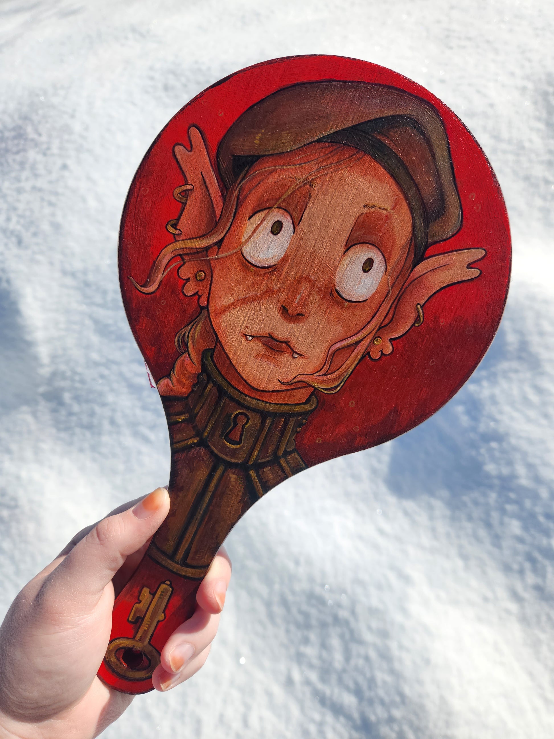 Simple wooden mirror painted with acrylics. Sealed with shiny UV resin. Front side of mirror is also painted red and sealed. Artwork features vampire solider wearing a worn beret, keyhole gorget, and gold piercings.